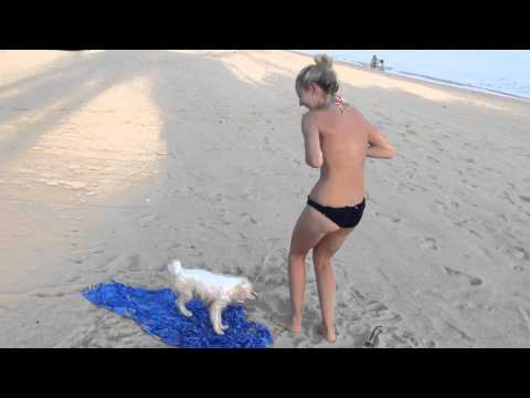 Der Hund als bester Freund des Menschen, dies ist bekannt. Dieser Hund will aber mehr. Einer schönen Frau am Strand hat er das Oberteil bereits geöffnet und möchte nun alles sehen. Abschütteln lässt er sich nicht. Im Gegenteil nun will er auch ans Höschen. Wahrscheinlich war er in einem früheren Leben Casanova.